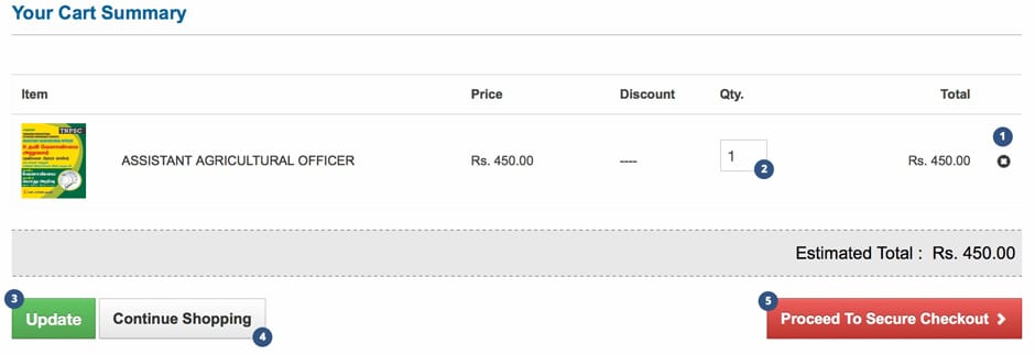 In ‘Your Cart Summary’ page, 5 icons are provided for your convenience by which you proceed with the following steps.